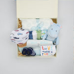 This delightful hamper is thoughtfully curated with a soft, fluffy blanket for cozy moments, a fun and engaging hippo musical toy, and adorable booties to keep those little feet warm. It also includes a gentle muslin swaddle, perfect for wrapping your baby in comfort. We've added a cozy onesie, a pack of four absorbent washcloths, and a set of two silicone bibs to make mealtime mess-free. This hamper is an ideal gift to cover all your baby’s essential needs!